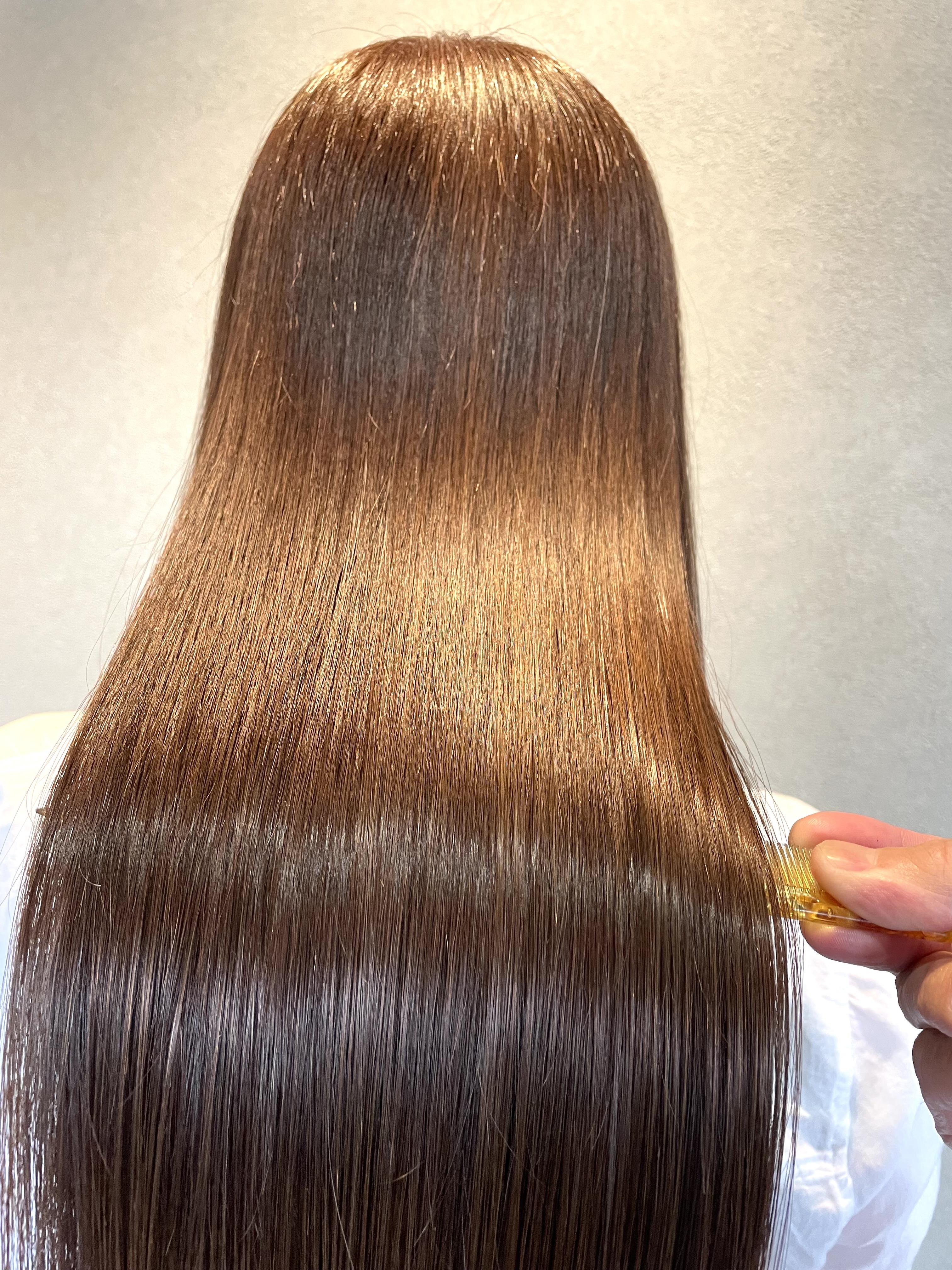 《酸熱ケアトリートメント+イオンコートトリートメント》酸と熱の化学反応を利用して髪内部に新結合を作ります。ウネリ・パサつき・広がりさなどのお悩みを解消し、周りから褒められる艶感と人生初の手触り感をご提供致します。(約1カ月効果持続)