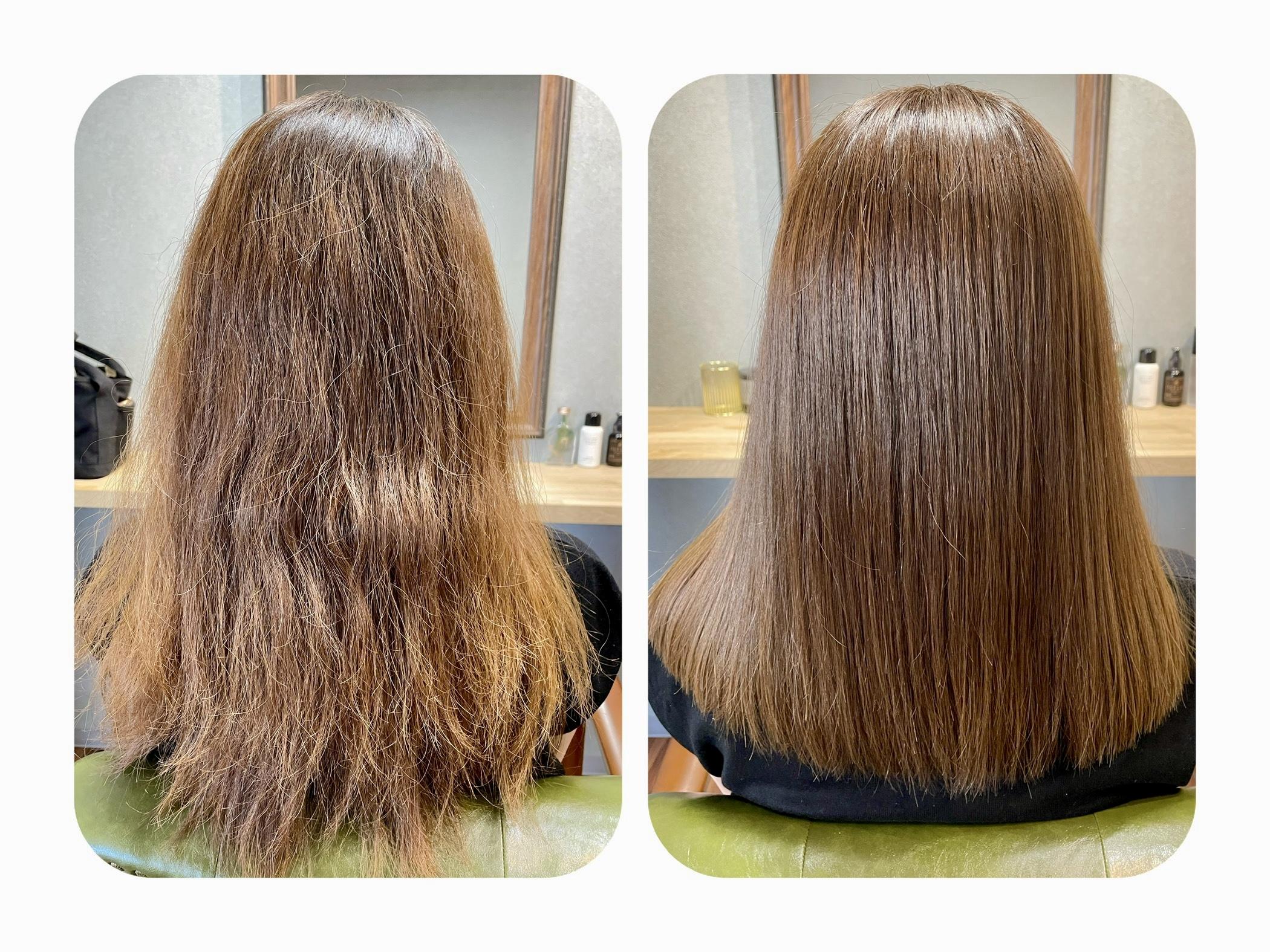 《酸熱ケアトリートメント+内部補修トリートメント》酸と熱の化学反応を利用して髪内部に新結合を作ります。ウネリ・パサつき・広がりさなどのお悩みを解消し、周りから褒められる艶感と人生初の手触り感をご提供致します。(約1カ月効果持続)